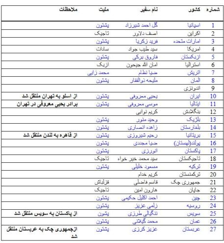 جدول سفرا و جنرال قونسلهای افغانی مقیم کشورهای مختلف جهان