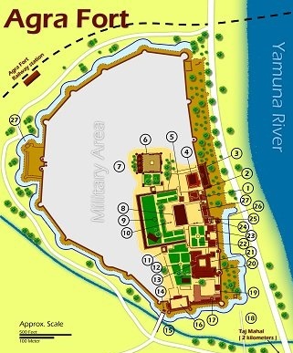 «پس از تاج محل، قلعه آگرا از مراكز ديدني هند است كه اكبر، امپراتور مقتدر مغول آنرا ساخته شده. قلعه آگرا تركيبي از عمارتها و كاخهايي است كه توسط اكبر، جهانگير، شاه جهان و ارانگزب بنا شده و در واقع به موزه اي از بناهاي متنوع فرمانروايان مغول تبديل شده است. قلعه از ديوارهاي محكم و ضخيم از جنس سنگ ماسه اي ساخته شده است. قبلا دو راه آب پر از كودكوديل و قورباغه در اطراف آن قرار داشت كه عبور دشمن را مشكل مي كرد. ساخت آن حدود هشت سال و تحت نظارت كشيم خان، فرمانده ارشد اكبر و حاكم كابل انجام گرفت. اين قلعه پيش تر چهار دروازه داشت كه امروز دو دروازه داير است. دو دروازه ديگر يعني دروازه آب و دروازه درشاني براي هميشه مسدود شده است. دروازه ضلع جنوبي، دروازه امر سينگ، مخصوص عموم است. پس از عبور از اين دروازه، كاخ جهانگير، گريپ گاردن، خاص محل، ديوان خاص، شيش محل، سومان برج، نگين مسجد، ديوان عام، مينا مسجد و موتي مسجد است. دروازه دهلي، كه ورودي اصلي رو به مسجد جامع اصلي آگراست. امپراتور مغول براي عبادت خورشيد در حال طلوع از دروازه درواني كه امروز بلا استفاده است، استفاده مي كرد. اكبري محل، شاه جهاني محل، كلا تخت، سيف تخت و سليم گره نيز ارزش ديدن دارد. در كل مي توان گفت قلعه آگرا مانند تاج محل از نمونه هاي زيباي معماري مغولی است». (برگرفته از مقدمه بروشور سازمان گردشگری هند)