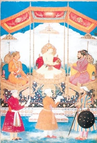 «تصویر گروهی از یک خاندان: اکبر بین پسرش، جهانگیر و نوه اش، شاه جهان نشسته است و تاج تیموری را به شخص اخیر منتقل می کند. در مقابل هر یک از این افراد وزیرش ایستاده است: از چپ به راست، اعتماد الدوله، خان اعظم و آصف خان». (کخ، معماری هند در دوره ی گورکانیان، ص ۱۶)