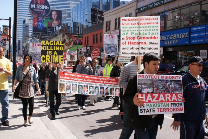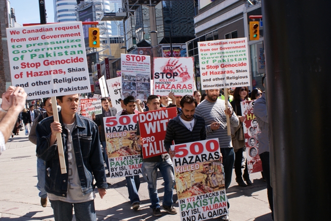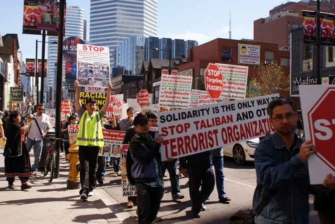 روز ششم می، هزاره های مقیم تورنتو و حومه آن بخاطر اعتراض از قتل عام مردم هزاره در کویته پاکستان راه پیمایی اعتراضی را به راه انداختند. راه پیمایی ساعت 3:30 از نقطه مرکزی شهر "دندس سکوار" آغاز شد و تا کوینس پارک، جاییکه عمارت پارلمان ولایت آنتاریو موقعیت دارد، ادامه یافت.