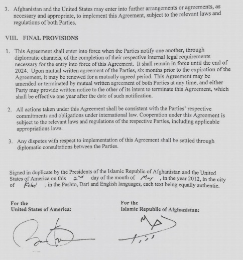 در رابطه به دو ماده این پیمان (کنترول زندان و عملیات های شبانه) نظر بنده اینست، که این مداری وبادار امریکائی اش خوب میدانند، که هیچ قدرت نمیتواند، تمام عمر یک جنگ را ادامه بدهند. جنگ امریکا در افغانستان طویل تر از جنگ علیه ویتنام، آلمان نازی و عراق است. هزینه این جنگ برای امریکا بیشتر از آن است که بتواند، سال های متمادی آنرا بپردازد. امریکا مجبور است، روزی به این جنگ خاتمه دهد. پس چه بهتر که هم حلوا بدست آید و هم دل یار نرجند. امریکا هم از شر این مصارف گزاف و تلفات قوایش نجات یابد و هم افغانستان را از آن خود سازد.