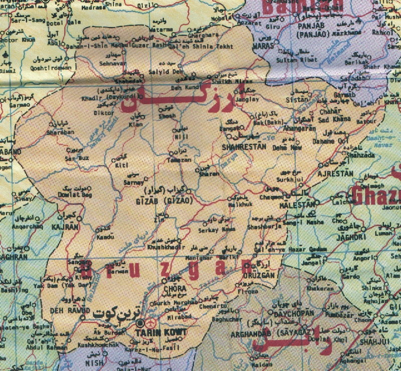 "ملک ارزگان و قلندر و بوباش و میانشین و پشئه و شیرداغ و زاولی سلطان احمد و حجرستان و تمزان و گیزاب را تا متصل جرغی و مالستان و هزاره دای زنگی و تمام چنانچه بیاید به مهاجرین و ناقل افغان داد، فقط ..."2