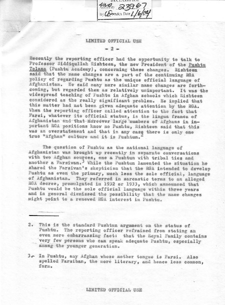 مسئله پشتو منحیث زبان ملی افغانستان دراین اواخردرگفتگو با دو منبع افغانی، یک پشتون (دارای علایق قبایلوی) ویک فارسیوان (3) مطرح بحث قرارداده شد. در حالیکه پشتون ازوضع ناراض وغمگین بود، با شک وتردیدی فارسیوان همنوا بود که حکومت، تمایلی درجهت انکشاف پشتو منحیث زبان اولی، وحتی کمتراز یگانه زبان رسمی، افغانستان داشته باشد. آنها بطوراستهزا آمیزبه یکی ازفرمانهای حکومت اشاره کردند که درسالهای 1932 یا 1933 صادر واعلان شده بود که، درجریان سه سال، پشتو یگانه زبان رسمی کشور خواهد گردید، وبصورت عام این امکان را رد کرد که تغییرنامها میتواند اشارۀ به علاقمندی مجدد حکومت به زبان پشتو باشد.