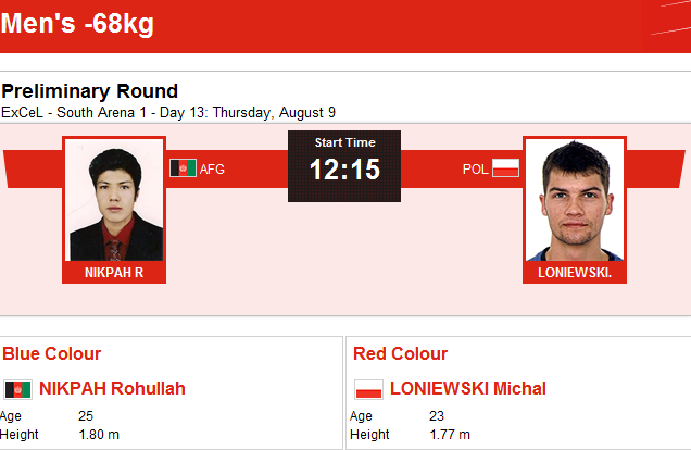 روز پنجشنبه 9 آگوست ساعت 12.15 به وقت لندن، روح الله نیکپی 25 ساله، در وزن 68 کیلو، مقابل حریفی از کشور پولند قرار می گیرد.