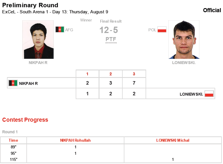 روح الله نیکپی توانست در نخستین دیدار خود با امتیاز 12 بر 5 از سد رقیب پولندی خود بگذرد. این نخستین پیروزی افغانستان در المپیک لندن است. با پیروزی قاطع روح الله نیکپی، فردا جمعه نثار احمد بهاوی به آسانی می تواند از سد حریف مراکشی خود بگذرد.