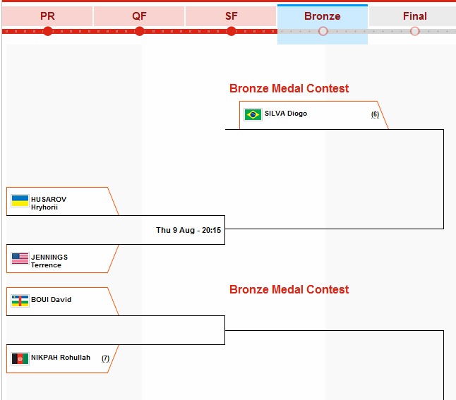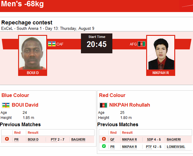 با شکست تکواندوکار برزیلی از حریف ایرانی خود، روح الله نیکپی شانس رقابت برای رسیدن به مدال برنز را بدست آورد. او برای رسیدن به مدال برنز باید از سد حریف آفریقای مرکزی بگذرد و پس از آن با یک تکواندو کار انگلیسی به رقابت بپردازد.