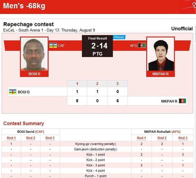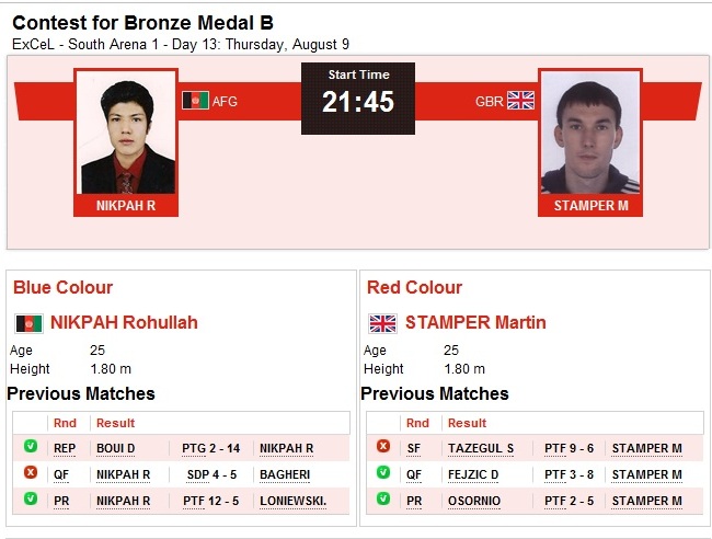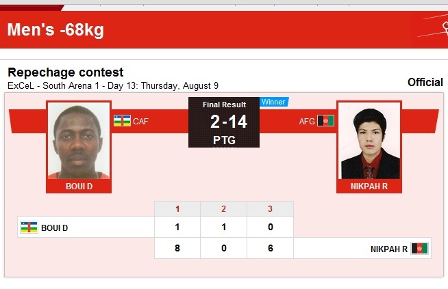 روح الله نیکپا امشب ساعت 8.45 دقیقه به وقت لندن به مصاف رقیب خود از کشور جمهوری آفریقای مرکزی رفت و توانست او را با نتیجه ی 14 بر 2 شکست دهد. او باید خود را تا ساعتی دیگر برای رقابت به تکواندوگار انگلیسی آماده کند.