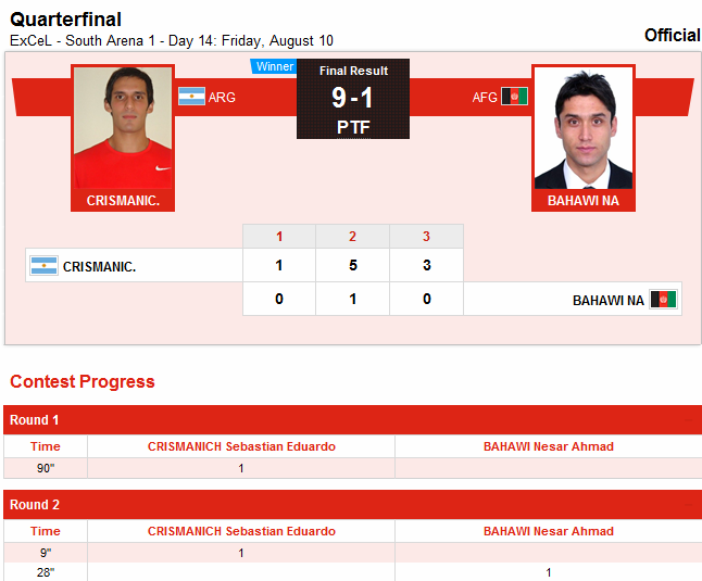 نثار احمد بهاوی امروز ساعت 4.45 عصر به وقت لندن، مقابل حریفی از کشور آرژانتین قرار گرفت و با نتیجه ی 9 مقابل 1 رقابت را به حریف خود واگذار کرد. نثار احمد متاسفانه از ناحیه پا آسیب جدی دیده بود و حتا در میانه ی این رقابت نیز یک بار به دلیل آسیب به زمین خورد.