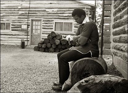 در این عکس که به تاریخ آگوست 1974 در پنسیلوانیا گرفته شده است و او در حالیکه چندان سر حال نیست بر روی یک کنده درخت نشده است.