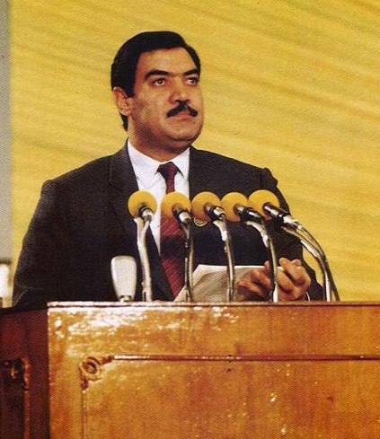«در ظاهرامر نجیب الله برای پیش برد برنامه دراماتیک "مصالحه ملی" که از جانب مسکو برنامه ریزی شده بود، انتخاب مناسبی می نمود. او هنوز هم با وجود تغییر شیوه نصب شدن با خطر نامیده شدن دست نشانده مواجه بود. او که از سال 1981 رئیس خاد بود در ذهنیت مردم شخص سفاکی بود که امر شکنجه های غیر نسانی هزاران نفر را صادر کرده بود، مگر سر و کارداشتن طولانی او با خاد در عین زمان او را در شناخت و درک درست اقوام پشتون واقع در دو طرف مرز دسترسی کامل بخشیده بود. رویهمرفته جاذبه های او بیشتر از نقاط مشمئزکننده او بود. اگرچه او یک عضو برجسته جناح پرچم حزب دموکراتیک خلق بود مگر نسبت او به قوم غلزایی پشتون چانس همکاری نزدیک او را با خلقی های غلزایی مسلط در اردو بیشتر میساخت...گورباچف عقیده داشت که نجیب الله به حیث نوکر درجه اول کی. جی. بی قابل اطمینان به اجرای هر عملی بود که از جانب مسکو برایش هدایت داده می شد.» (13)