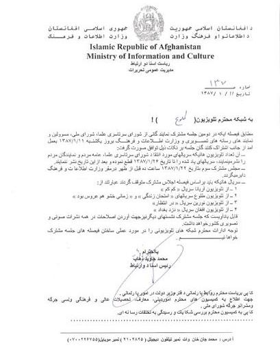 The day before, the information and culture ministry issued a release (of which Reporters Without Borders has a copy) condemning a programme the previous day on Tolo TV showing men and women dancing together. This was "against the beliefs and traditions of Afghanistan’s Islamic society," the ministry said. A Tolo TV representative told Reporters Without Borders that in the programme (a re-transmission of the "Afghan Oscars"), most of the women had their heads covered, and that the movements of the dancers were "very restrained."