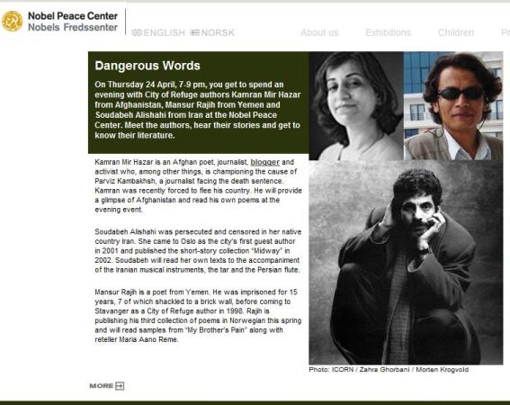 کامران ميرهزار، شاعر، نويسنده و سردبير کابل پرس?، روز پنجشنبه در مراسمی با هماهنگی سازمان آی سی او آر ان، انجمن قلم نروژ و مرکز صلح نوبل، در مرکز صلح نوبل در اسلو پايتخت کشور نروژ شعرخوانی خواهد داشت. بنا به خبر مرکز صلح نوبل او علاوه بر شعرخوانی، درباره ی وضعيت آزادی بيان در افغانستان سخن خواهد گفت. در اين مراسم ابتدا آقای يلسن، رييس انجمن قلم نروژ، کامران ميرهزار را به حاضرين معرفی خواهد کرد. پس از آن کامران ميرهزار تعدادی از شعرهايش را خواهد خواند. يکی از شاعران و روزنامه نگاران نروژ شعرهای او را که به زبان نروژی ترجمه شده است، برای حاضرين می خواند. سپس وی وضعيت آزادی بيان در افغانستان را تشريح کرده و به سوالات رييس انجمن قلم نروژ و حاضرين پاسخ می دهد. پيش از شروع اين مراسم، کامران ميرهزار گفت و گو هایی اختصاصی با برخی از روزنامه های مشهور کشور نروژ خواهد داشت.