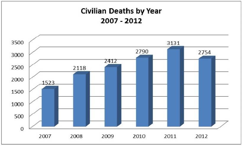 طبق گزارش سازمان ملل متحد تنها در سال 2012 میلادی 2754 تن غیر نظامی جانشان را در درگیری های مختلف از دست داده اند. بیشترین این کشتارهای نیز توسط نیروی مسلح پشتونیزم یعنی طالبان صورت می گیرد. در چند سال اخیر مافیای کرزی بنا بر اشتراکات قومی با طالبان، هزاران تن از آنان را از زندان ها رها کرده و هزاران تن دیگر را نیز در نیروهای امنیتی همچون پولیس و ارتش جابجا نموده تا سیاست انتقال جنگ به مرکز و شمال سرعت پیدا کند.