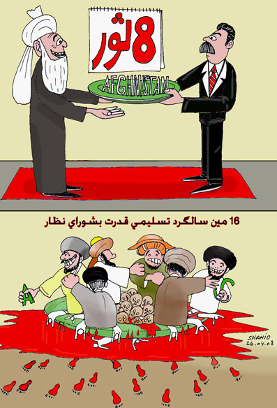 قبلآ در باره کارتون رئیس صاحب جمهور بشما چند سخنی گفته بود فکر میکنم بالای شما تائثیر بد داشت چراکه امروز وقتی کابل پرس? را چک کردم تصویر فوق را از بین برده بودید به هر حال آینده کوشش نکنید که به همچو عمل دست بزنید.
