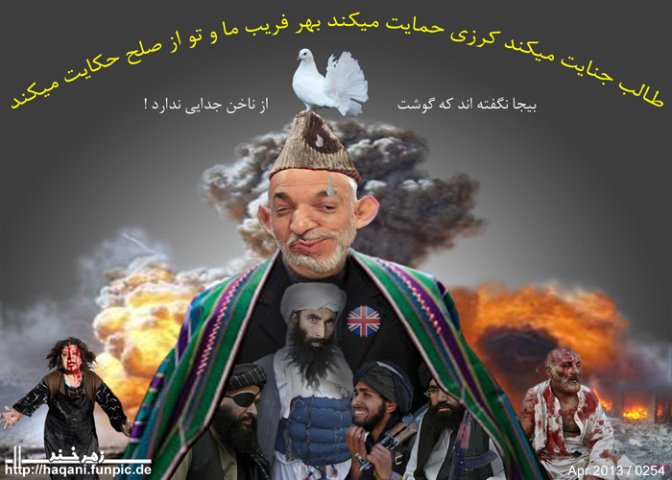 بابا پشت ملاعمر کور را رها کنید. طالبان از کجا شدند؟ازپاکستان با نقشه انگلیس. پس با پاکستان باید مذاکره شود. قیضه وجلو بدست پاکستان است. طالبان اصلا هیچ گویی هم نیستند وهیچ اختیار ندارند. طالب یعنی هیچ. هرچه است پاکستان است. وجلو پاکستان هم بدست انگلیس پس بروید لندن را شخ محکم بگیرید تا پاکستان را بجایش بنشاند. همین وبس