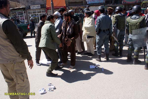 جواسیس امنیت ملی، یکایک تظاهرکنندگان را با بینزاکتی چندین باره بازرسی بدنی نموده بعد اجازه ورود میدادند. آنان اعلامیه های چاپی حزب را از نزد افراد ما گرفته پاره پاره کرده بر زمین انداختند. پلاکارتهایی حاوی تصاویر مقامات بلندپایه دولتی و شعارهایی را که با مذاق جنگسالاران خوش نمیخورند ضبط نموده در وسایط پولیس انداختند.