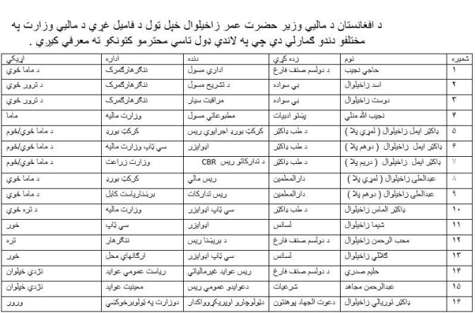 آنچه در ادامه می آيد متن و فهرستی ست که ظاهر قدیر در صفحه فیسبوک خود از روابط فامیلی در وزارت مالیه افغانستان به رهبری زاخیلوال منتشر کرده است.
