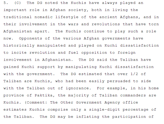 کابل پرس?: تنها مقایسه ی دو سند نشان می دهد که محمود خان سلیمان خیل یکی از رهبران کوچی، سابق رئیس مستقل انسجام امور کوچی ها و در حال حاضر وکیل از ولایت پکتیکا در پارلمان ، به افکار عمومی و خبرنگاران در جریان جنایات کوچی ها در بهسود و دایمیرداد می گوید کوچی ها مسلح نیستند و از سوی دیگر به مقامات سفارت آمریکا در کابل می گوید که بیش از نیم گروه طالبان را کوچی ها تشکیل می دهند. سند محرمانه ی افشا شده از سفارت آمریکا توسط ویکی لیکس می گوید او حتا نمونه ای از ولایت خود پکتیکا می آورد که بیشتر فرماندهان طالب در این ولایت کوچی می باشند.