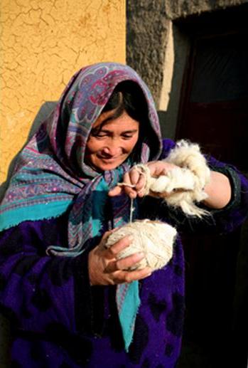 A woman spinning thread from sheep wool in Dashte Barche area of Kabul city.