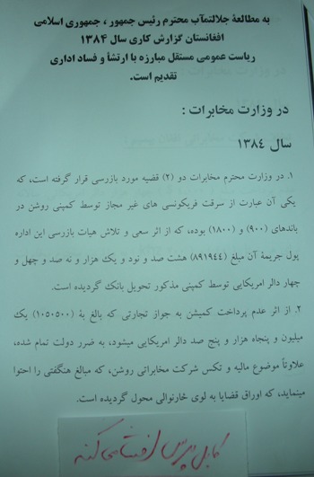 اشاره: آنچه در ادامه می آيد، يک مورد از اختلاس و سوء استفاده در وزارت مخابرات کشور می باشد که در گزارش سال 1384 رياست عمومی مستقل مبارزه با ارتشا و فساد اداری به رييس جمهور کرزی به آن اشاره شده است. اين گزارش متاسفانه در اختيار رسانه ها قرار نگرفته و کابل پرس? برای نخستين بار آن را بدون کم و کاست در اختيار افکار عمومی قرار می دهد. کابل پرس معتقد است که افشای چنين اسنادی جرم نبوده و بلکه حق مسلم مردم می باشد. برای موارد اختلاس به گزارش اين رياست، در کابل پرس بخش جداگانه ای باز شده که ما به مرور آن را نشر می کنيم.