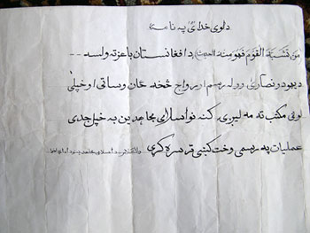 سلام حضور خانم فاطمه مشتاق مدیر محترمه ای تعلیم و تربیت ولایت غزنی. از حضور شما خواهشمندیم که از وظیفه ای خود کناره گیری کنید. در صورتیکه از این درخواست سرباز بزنید و از مقام کنار نروید. حادثه ای در انتظار شما خواهد بود که شما به سوگ یکی از اعضای خانواده ای خود خواهید نشست. من به عنوان یک برادر این مسئله را به شما بازگو میکنم، من شما را یک آدم کاملا بی دین و کافر میدانم. تأکید میکنم، از سمت تان کنار بروید. اگر در خواست مرا نادیده بیگیرید سرانجام خوبی در پی نخواهد داشت. ناگفته نماند که روزی در مکتب جان ملیکه شنیدم که ولی صاحب از احمدشاه مسعود به تکریم و تمجید پرداخته بود همان روز می خواستم تو را به کام مرگ بفرستم اما صدافسوس که ولی اسدالله در آنجا حضور داشت، به خاطر حضور ایشان نتوانستم کاری انجام بدهم. اما اگر از سمت خود کناره گیری نکنید به شما حمله کرده و به کام مرگ خواهم فرستاد.
