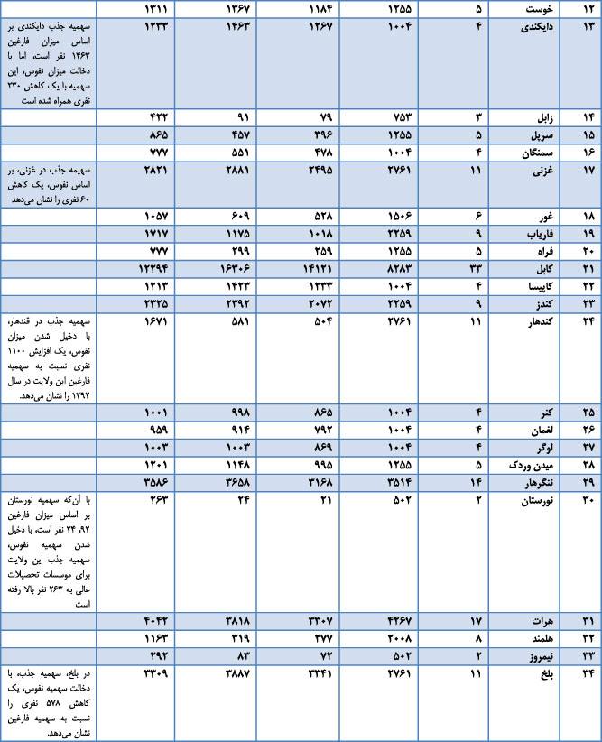 در سندي كه در اختيار اين‏جانب قرار گرفته، جذب فارغان صنوف دوازدهم دانشگاه‏ها و موسسات تحصيلات عالي از طريق امتحان كانكور سراسري، بر اساس «نفوس» و «تعداد فارغان» ولايات به شرح ذيل است: