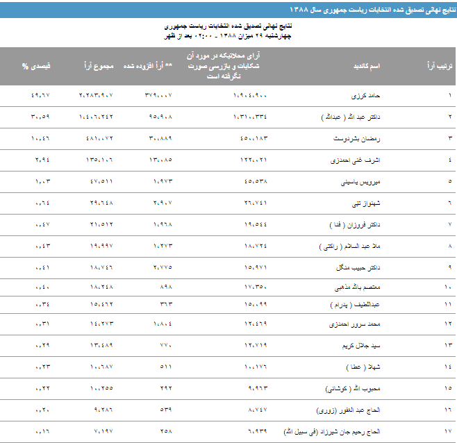 در این انتخابات، بنا به آمار رسمی کمیسیون انتخابات افغانستان، حامد کرزی ٢,٢٨٣,٩٠٧ رای، عبدالله عبدالله ١,٤٠٦,٢٤٢ رای و رمضان بشردوست ٤٨١,٠٧٢ رای بدست آوردند. حامد کرزی با وجود تخلف و تقلب برنامه ریزی شده، در این انتخابات نتوانسته بود پنجاه درصد از جمع آرا را بدست آورد. اشرف غنی احمد زی در این انتخابات توانست ١٣٥,١٠٦ رای بدست آورد.