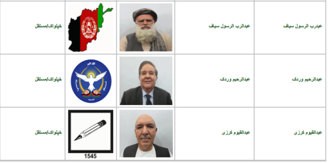 قطب الدین هلال، عبدالله عبدالله، زلمی رسول، عبدالرب رسول سیاف، عبدالرحیم وردک، عبدالقیوم کرزی، محمد اشرف غنی احمدزی، محمد شفیق گل آغا شیرزی، محمد نادر نعیم و هدایت امین ارسلا