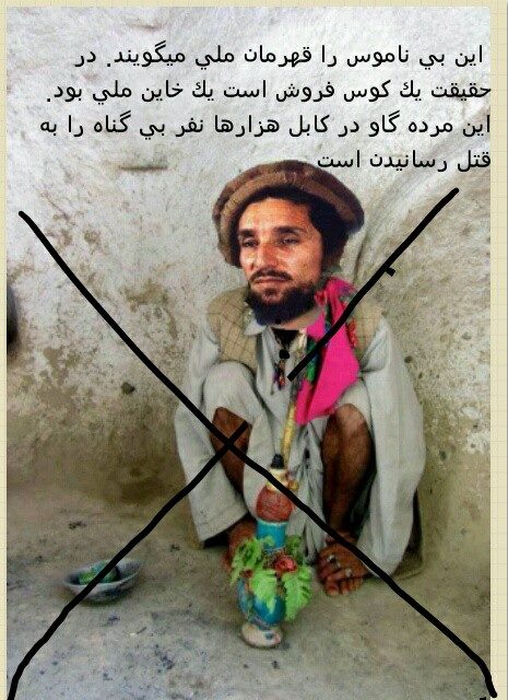 جنگ نکرده و زنان تانرا بکابل پیشمردم کابل و اوغان طالب رها و خود فرار کردید حال به افتخار از تجاوز به خواهر و مادر و زن کابلی ها یادکرده و مرا و فاملیم را نیز جز از انان حساب میکنی ایا روشنفکر مسلمان کمونست سکولر همین وجدان را دارد که بر مرده مردم و یا بر بی زبان ها و صغیفان بی دفاع که مورد تجاوز مسلمانان وقهرمانان ملی قرار گرفته اند افتخار کنند؟ در حقیقت شما باعث سوختن و کشتن و تجاوز کابل و اسیر و حریق خانه و باغ نقل وانتقال زن و کودک... و باغ شمالی و کشتار هرات بامیان مزار از جانب مزدوران پاکستان گلبدین و طالب و حلقه متخاصم ربانی استید , این را هر ازاده مرد شمالی و کابل ... میدانند ایا با این کشتن و تجاوز غارت کردن مهاجرت به داخل و خارج(بنا بر فرموده خودت که به افتخار از ان یاد میکنی) باز هم سبک سری پیدا خواهد شد تا این جاسوس های پاکستان ایران وهابیت و فرانسه و امریکا را قهرمان بدانند ؟, در دوره مقاومت هرروز مردمان شمالی این را بزبان می اوردند که روبار ده غارش درامد و دهان سوراخ اش را چپه کرد و اینک ما میسوزیم , از بی عدالتی کابلش بود که موقیع که تا اخرین زمان نجنگید و فرار کرد!! حال تهنه زنانه بدیگران میزنید گویا تا اخرین زمان جنگ نکردید, هیچگاه پنحشیری تا اخر جنگ نکرده با روس معاهده با امریکا و دیگران ! , مردمان شمالی ران های زنان تانرا لمس نقود و زیور دزدی تانرا را بدست اوردند اینان تاجک نبودند ! قهرمان ملی تاجکان !! افتخار اش کشتار تحریب تجاوز از هم پاشی یک نظام مجهز از بین بردن تمام سستیم های شهری از برق و ترانسپورت و حدمات عامه و ایجاد تفرقه مذهبی ملیتی منطقوی تجاوز به زن و کودک ایجاد بستر تروریزم اینک بستر ناتو و امریکا و تحریک بیشتر همسایه ها و قدرت ها که بخش دفاعی و جاسوسی ... شان به وطن ما فوکس شده !