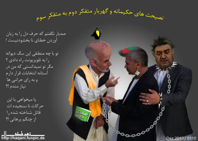 حالا هم بهتر خواهد بود که خودت مدتی از صبر و خویشتن داری کار گرفته و انتظار بازگشت دوباره و استحکام مجدد امارت اسلامی افغانستان را بکشی و دیگر با حرکات ناسنجیده ات نه پلان های مرا به خطر مواجهه سازی و نه برادر بزرگ مان کرزی صاحب را در موقف قرار دهی که نزد هر کس و ناکس با زیر پا کردن غرور افغانی اش خرابی های شما را ترمیم کند.