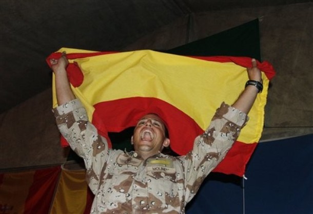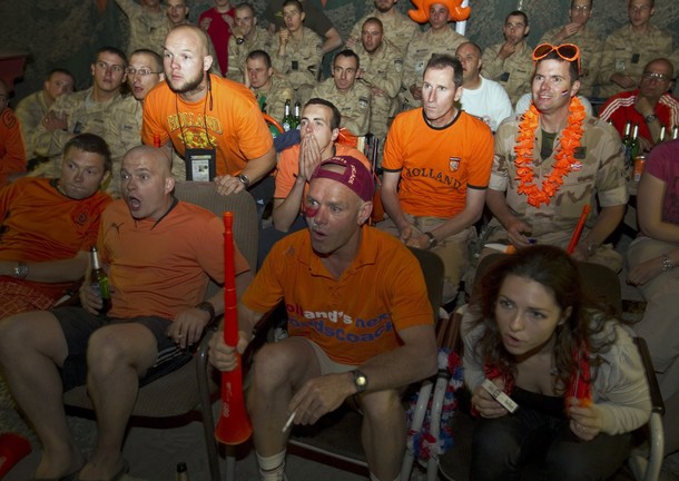 سربازان اسپانیایی و هلندی در افغانستان هنگام دیدار نهایی جام جهانی فوتبال