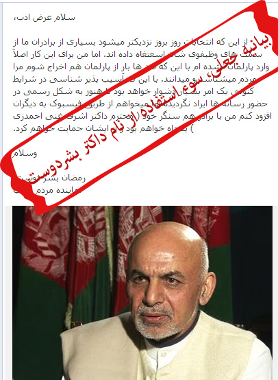 در یکی از این بیانیه های جعلی، طرفداران اشرف غنی احمدزی از قول داکتر بشردوست نوشته اند که او در انتخابات ریاست جمهوی سال آینده از اشرف غنی احمدزی حمایت می کند. این در حالی ست که در انتخابات ریاست جمهوری قبلی، اشرف غنی احمدزی با وجود هزینه کردن بیش از نیم میلیون دالر، رای ناچیزی را نسبت به آرای داکتر بشردوست بدست آورده بود.