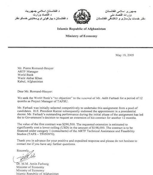 In this document, the World Bank is requested to renew the contract of Mr. Farhadi for another year, but at a lower annual salary of $198,000.