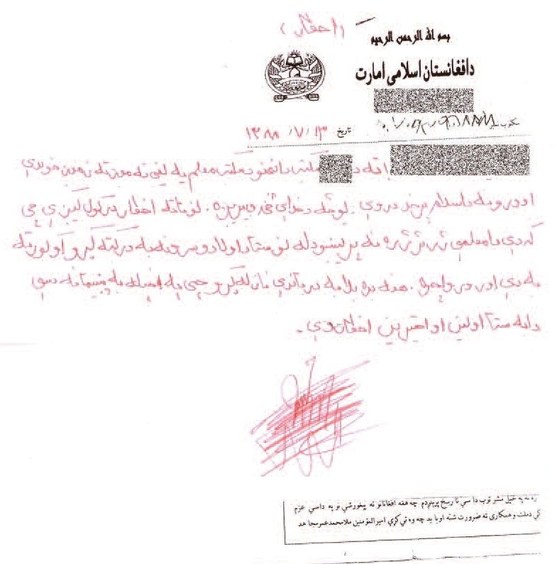 "از طرف ما قبلا به شما خبر داده شده بود که مکتب را ببندید و دختران پاک و معصوم را تحت این حکومت غیراسلامی گمراه نکنید؛ اما شما توجه نکردید... این آخرین اخطار است که مکتب را بلافاصله ببندید... اگر در این ولایت بمانید، به خاطر داشته باشید که شما و خانواده شما نابود خواهید شد."