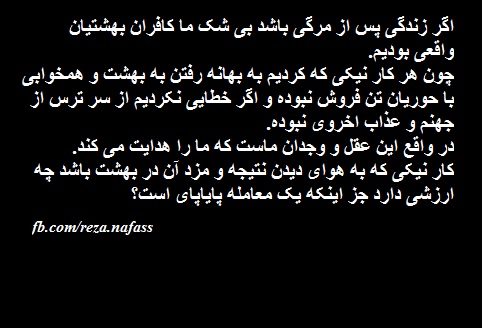 سم دین وقتی وارد بدن شد جلو تفکر ازاد را می گیرد معتقدان به دین خرف می شوند ویا در طمع حوریان بهشت افسانه ای دست به هر جنایت وهر کار ابلهانه وغیر عقلی می پردازند و یا از ترس جهنم دروغین به مانند گوسفندان می شوند برده بی فکر وبی اراده زیرا دین به پیروان ساده وابله خود فرمان می دهد که هان ای مخلوق خدا تو فکر نکن بگذار من به جای تو فکر کنم چون عقل تو کم است …وظیفه هر مسلمان واقعی اینست که کتاب قران را یکبار هم اگر شده با کمال دقت کامل بخواند ومخصوصا از نظر قانون بشر وهم علوم ودانش ها مقایسه کند .من مطمئن هستم وهیچ شکی ندارم هرکسی که قران را یکبار با دقت بخواند ودر ان تعقل کند وحتی با علوم ودانش ها مقایسه کند بزودی پی می برد که نه تنها این کتاب الهی نیست واز طرف خدا نمی تواند باشد بلکه مجموع مهملات یک مردی نادان وبیمار روانی کینه توز وجنایتکار است که انچه به شیطان نسبت داده شده همه را در این دین قران دارد البته با کمی تغییر نام وتغییر واژه اگر از مسلمانان سوال کنید که شیطان چه می کند می گویند شیطان مردم را فریب می دهد وبه قتل وکشتار ودزدی وغارت وتجاوز و…وامی دارد محمد همه اینها را به اسم دین والله در کتاب خود دارد