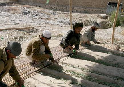 Turkmen men weaving bamboo together in the Mawla Ali area of Marzar-i-Sharif.