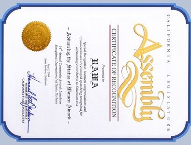 تصدیقنامه افتخاری از سوی مجلس مقننه كالیفورنیا