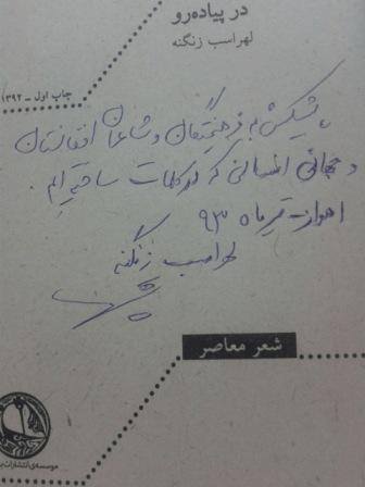 دوستان زیادی در پهنه دنیای مجازی دارم که شاید هنوز آنها را ندیده باشم، ولی از آنهایی که ممکن است در طول روزها همدیگر را ببینیم، به خود نزدیکتر حس میکنم. یکی از آن عزیزان، لهراسب زنگنه است. نخستين گزیده شعر این دوست بزرگوار و شاعر خونگرم با نام «در پیادهرو» (بوتیمارـ1392) به دستم رسید که دربردارنده چهل شعر نو و نقد و نظر شاعرانی مانند: هرمز علیپور، رضا بختیاریاصل، یارمحمد اسدپور، حسينعلی خداکرمی، امید هلالی و حاجیپور بر این شعرهاست.