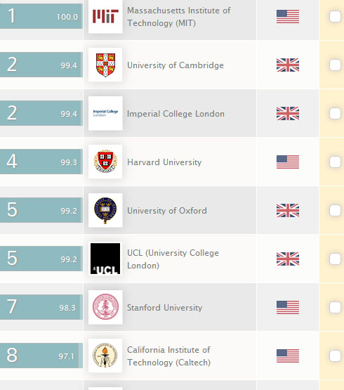 در رتبه بندی این موسسه، انستیتوت تکنالوژی ماساچوست، دانشگاه کمبریج، کالج امپریال لندن، دانشگاه هاروارد، دانشگاه آکسفورد، کالج دانشگاهی لندن، دانشگاه استنفورد، انستیتوت تکنالوژی کالیفرنیا، دانشگاه پرینستون و دانشگاه ییل به ترتیب جزو ده دانشگاه برتر جهان می باشند.