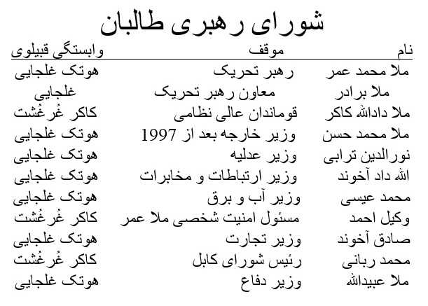 این تحریک عمدتاً توسط یک قبیله واحد رهبری می گردد. اکثریت شورای رهبری طالبان از قبیله هوتکی با چند استثناء در مورد برخی افراد قبیله کاکر از کنفدراسیون قبایلی غُرغُشت که به ملا عمر نزدیک هستند، ميباشد.