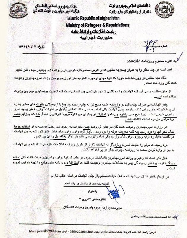 1- اسناد و مدارکی که قبلاً توسط هشت صبح به نشر رسید، اتهام نیست بلکه مدارکی است که همین حالا هم در سایت‌های اینترنتی وجود دارند. تهیه آن اسناد و مدارک کار قابل قدر و بزرگی در راستای مبارزه با فساد و رشوت بود؛ اما متأسفانه از وزیر امور مهاجرین بازخواست جدی نشد. از طرف دیگر آن مدارک تمام جنبه‌های مختلف فساد و کم‌کاری و سو استفاده در وزارت امور مهاجرین را در برنمی‌گرفت. اسنادی که در هشت صبح به نشر رسید، بیشتر به اختلاس‌های بزرگ مالی و فروش پست‌های کلیدی این وزارت و استخدام اشخاص بی‌سواد که اکثریتشان از اعضا و دوستان نزدیک آقای انوری‌اند، می‌پرداخت. فرضاً در آن گزارش هیچ یادی از قراردادهای شرم‌آور وزیر امور مهاجرین با کشورهای اروپایی و استرالیا درزمینهٔ دپورت اجباری پناه‌جویان نشده. امضای این قرارداد با آن کشورها تنها شاهکار جماهیر انوری نبود بلکه در همان روزهایی که آن گزارش در هشت صبح به نشر می‌رسید، وزیر امور مهاجرین سفری به کشور ترکیه داشت. در آن سفر آقای جماهیر انوری قراردادهای با UNHCR بست که درست بعد از 15 روز از سفر آقای انوری این دفتر بررسی پرونده‌های پناه‌جویان افغانستانی را برای شش ماه به تعویق انداخت که متأسفانه باوجود اعتراض‌های گسترده مهاجرین در ترکیه تا هنوز این موعود تمدیدشده و دفتر UNHCR پناه‌جویان را ثبت‌نام نمی‌کند. این قراردادها را جماهیر انوری در حالی بسته است که تنها درسال گذشته بیش از 700 نفر از پناه‌جویان افغانستانی در مسیر راه استرالیا کشته‌شده و صدها تن دیگر در مسیر راه ترکیه و اروپا. وقتی دفتر UNHCR پرونده پناه‌جویان را در ترکیه بررسی نمی‌کند، آن‌ها مجبورند از راه‌های قاچاق خود را به اروپا برسانند که درنتیجه آن تعدادی کشته می‌شود و آقای انوری مسئول مستقیم مرگ آن‌ها است.
