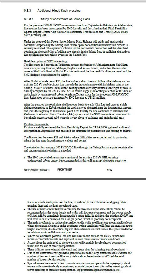 در حال حاضر برق خریداریشده از کشورهای شمالی افغانستان توسط یک خط دومدارۀ ۲۲۰ کیلوولت از مسیر سالنگ به کابل میرسد. زمانی که بررسیها برای اجرای پروژۀ کاسا ۱۰۰۰ شروع شد، یک شرکت کانادایی(SNC-Lavalin) که مسئول تهیۀ طرح آن بود، در گزارشش تأکید کرده بود که امکان گذشتن خط انتقال برق «کاسا ۱۰۰۰» از مسیر سالنگ وجود ندارد و باید راه دیگری برایش جستوجو شود. با این وجود و به اصرار وزارت انرژی و آب، خط کاسا ۱۰۰۰ نیز از مسیری جریان یافت که قبلاً یک خط برق کشور از آن عبور داده شده بود؛ مسیر سالنگ. در اجرای سومین طرح (توتاپ) که مسیر آن براساس ماسترپلان جدید تعیین شده است، نیز چنین کارشکنیای رخ داده است. شرکت فشنر همواره در خلاصۀ گزارش خود، نیز در کل ماسترپلان برق تأکید کرده است که برای افزایش تولید داخلی برق و نیز مسایل فنی، مسیر خط انتقال «توتاپ» از پلخمری به سمنگان و بامیان تغییر داده شود و از آنجا به چوک ارغندی و سپس به کابل بیاید. اما اکنون حکومت برخلاف آن قرار است هرسه خط بزرگ انتقال برق شمال به جنوب را از مسیر سالنگ بگذراند. اصرار بانک انکشاف آسیایی این است که نباید چنین کاری انجام شود؛ ولی دولت اصرار دارد که این خط باید از مسیر سالنگ عبور داده شود. یک همکار و مشاور حوزۀ انرژی در این زمینه به من گفت: «طرح دولت افغانستان این است که باید این خطوط از سالنگ بگذرند. این پلان قبلی دولت افغانستان بوده است. دولت مطالعات دقیقی انجام نداده است و به صرف کوتاهبودن مسیر سالنگ، این راه را برگزیده است. هیچ گزارشی فنی که این مسیر را تأیید کند، وجود ندارد. نه شرکت کانادایی و نه فشنر و نه بانک انکشاف آسیایی، هیچکدام این را تأیید نمیکنند.» دولت تأکید دارد که با ساخت یک ساب استیشن در پلخمری آن را از مسیر سالنگ به کابل انتقال بدهد؛ و از اینجا یک خط ۵۰۰ کیلوولت کشیده شود و از مسیر سالنگ به چوک ارغندی بیاید و بعد به کابل و از این مسیر میتواند به پاکستان هم صادر شود. خط دیگری هم هست که از چوک ارغندی به لوگر سپس به خوست و گردیز میرود و خط دیگری که به غزنی و قندهار میرود. مشکل اصلی این است تمام خطوط انتقال برق از شمال کشور به کابل از مسیر سالنگ میگذرند. آقای حیدری میگوید،به لحاظ فنی چنین کاری به هیچ عنوان توجیه ندارد و اگر برای خطوط انتقال برق عبوری از سالنگ مشکلی پیش بیاید و خطوط انتقال برق قطع شوند، هر سه خط بزرگ انتقال برق که بخش بزرگ افغانستان و بخشهای از پاکستان را برق میدهند قطع خواهند شد و ما شاهد خاموشیهای گسترده خواهیم بود.