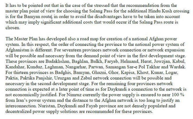 از سوی دیگر، در نقشۀ توزیع برق کشور، مناطق مرکزی و شماری از ولایات به شمول دایکندی، جایگاهشان تعریف نشده است. به این معنا در ماسترپلان ۲۰سالۀ که به تأیید دولت رسیده، بسیاری از مناطق عمدتا مرکزی به شبکۀ برق سراسری وصل نمیشوند.