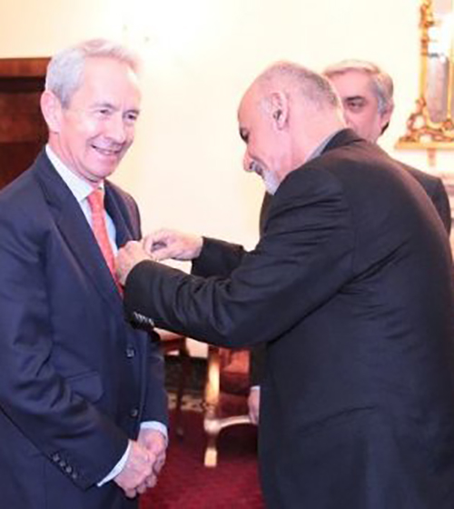 حکومت دست نشانده: ملا اشرف غنی احمدزی و عبدالله عبدالله در حال دادن مدال به سفیر بریتانیا