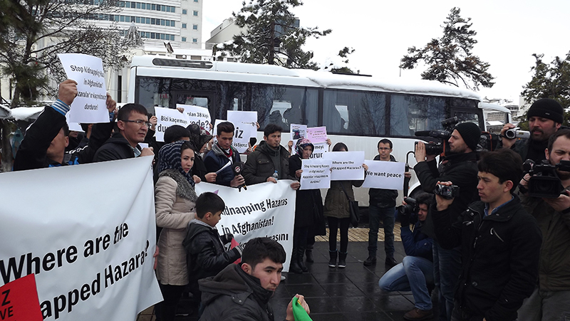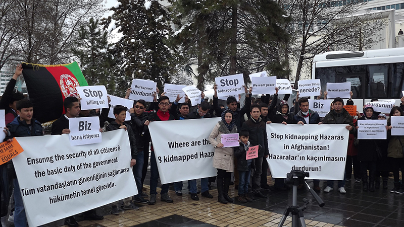 Kayseri, Turkey: Dozens of Afghanistani university students and refugees have staged a protest on Sunday condemning the recent kidnapping of the Hazara passengers in Zabul, Ghazni and Farah provinces of Afghanistan. The protestors say that, the roads to the central parts of Afghanistan, especially Kabul – Kandahar highway, are the most unsecured places where many people, mostly Hazaras, are being beheaded, kidnapped and targeted by the Taliban. According to the constitution of Afghanistan, the government is responsible to ensure the security of all citizens.