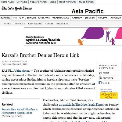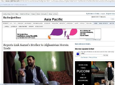 خبر اينکه احمد ولی کرزی دست داشتن خود را در تجارت مواد مخدر رد کرد نيز در سایت نيويارک تايمز با توضيح بيشتر و مفصل تر از خبر اسوشیتد پرس منتشر شده است. اينجا را کليک کنيد: