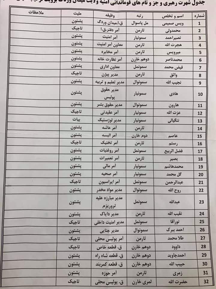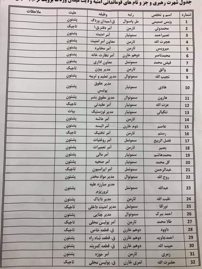 Kabul Press?: A list of officials in Maidan Wardak, Hazaristan, shows that 41 out of 42 officials, including the governor and security commanders, are Pashtuns, and only one of them is a Hazara. Another list containing the name of 32 security officials in Maidan Wardak shows that there is no any Hazara among them. In that list, 9 are Tajik, 2 are Bayat, and the rest are all Pashtuns. Having a province with almost all officials from one ethnic group created a safe haven for the Taliban, who share the same ethnic background.
