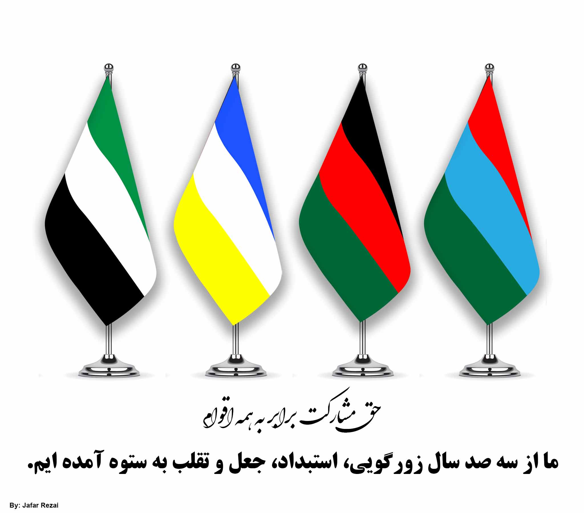 در این تصویر که توسط آقای جعفر رضایی طراحی شده، پرچم گروه های مردمی مختلف دیده می شود. این تصویر تاکنون هزاران بار در شبکه های اجتماعی شریک شده و بسیاری همراه با شریک کردن آن، خواستار همبستگی برای پایان دادن به سه صد سال فاشیزم، ویرانگری و چپاول، استبداد و زورگویی حکومت ها و گروه های تروریستی افغان/اوغو شده اند.