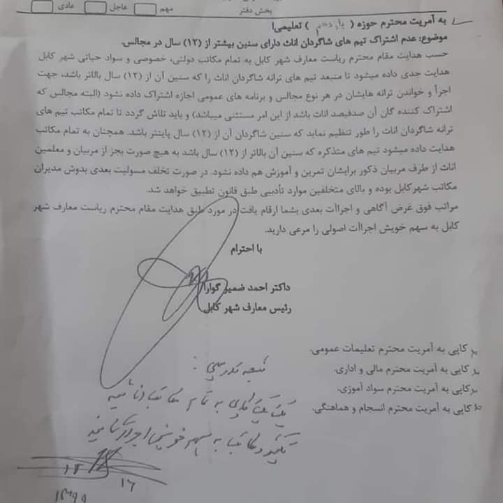 در روزهای اخیر نامهای به امضای یک مغزمتعفن ضد آزادیهای مدنی و ضد ارزشهای حقوق بشری از ریاست معارف شهر کابل دست به دست شده است که نشان میدهد به تمام مکاتب دستور داده است که دختران بالای دوازده سال در مراسم معارف ترانه و آهنگ و سرود نخوانند.