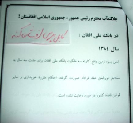 دو: شش بسوه زمين ملکيت بانک ملی افغان واقع در کارته 3 شهر کابل، به فردی بنام نورالحق بدون انجام مراحل قانونی و مزايده واگذار شده است.
